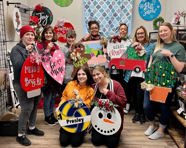 Is the perfect place to paint something fabulous for your front door or home! Join us for a public workshop or book your own private paint party with 6 or more of your favorite people! Bring along your creativity and your favorite food/beverages to enjoy while completing your project! We will help you do the rest!