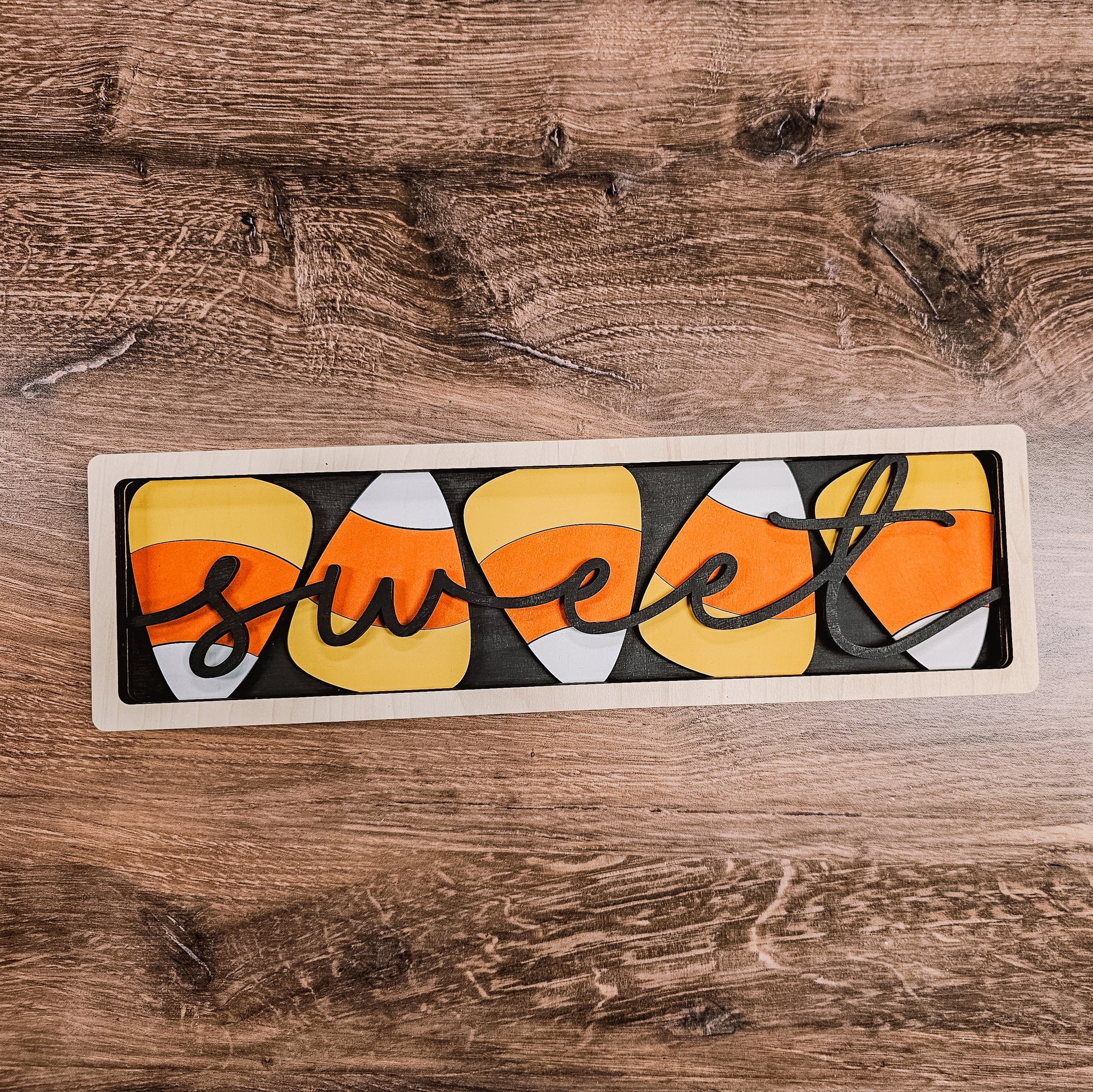 Add some sweet and spooky charm to your home with our Sweet Candy Corn shelf sitter. This darling piece features a 4 layered design and festive candy corn accents, making it the perfect addition to your Halloween decor.